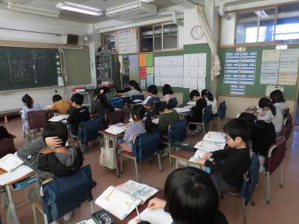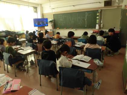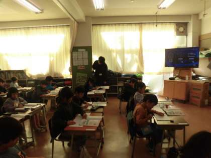 ひき算の学習をしています。子どもたちは一人ひとり問題を解いています。先生が子どもたちをまわっています。声も出さずにしっかりと課題に取り組む1年生です。