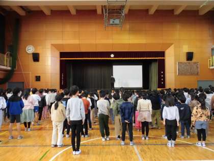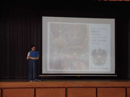 オーストリアへの派遣の報告です。学んできたことの発表を全校の子どもたちはしっかりと聞いていました。