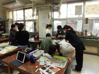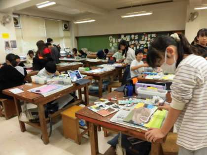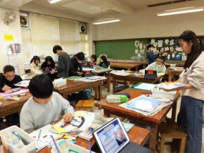 6年生の授業は図工です。ランドセルのスケッチをしています。下書きが終わり、子どもたちは絵の具で色を塗っています。塗り方でランドセルの皮の様子を表現している人がたくさんいます。6年生になると、表現の仕方が素晴らしいです。