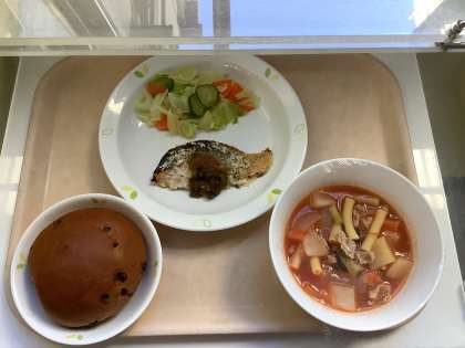 牛乳・チョコチップパン・ミネストローネ・マスのパン粉焼き・カレーピクルス