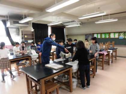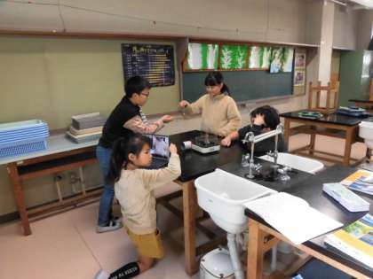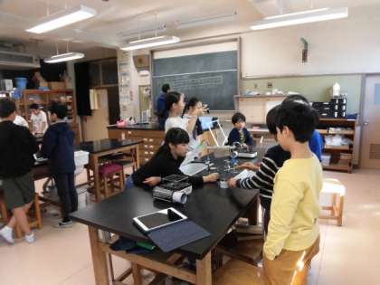 鉄の体積は温度によってどのように変化するを調べています。ガスコンロで鉄球を熱し、大きさの変化を調べています。あんなに硬くて重い鉄の大きさが変わってしまうのは、びっくりですね。