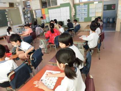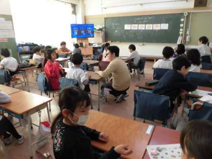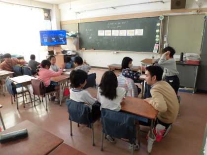 好きな食べ物を聞かれ、答えています。いろいろな食べ物の名前が出てきます。子どもたちは楽しそうに英語を口にしていました。