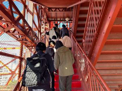 東京タワーに着きました。子どもたちは600段の階段をのぼります。途中、疲れてしまう人もいましたが全員最後までのぼりきることができました。