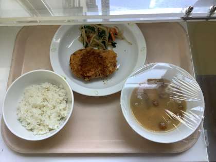 牛乳・麦ご飯・なめこの味噌汁・和風コロッケ・野菜の胡麻和え