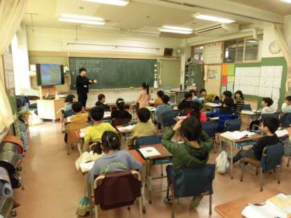 1年生の授業は算数です。教科書のイラストを見て、計算式を作り答えを求めています。