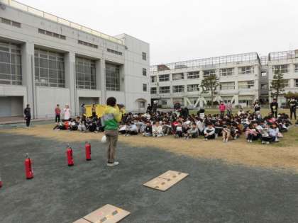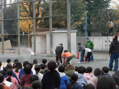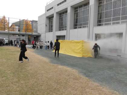 校庭への避難のあと、消火器を使った初期消火訓練、そして、煙中体験がありました。