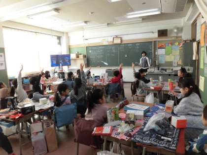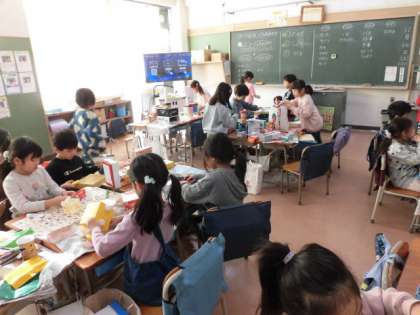 1年生の授業は図工です。家から空き箱を持ってきて、建物や動物、乗り物など自分の作りたいものを作っていきます。子どもたちはとても楽しそうです。作っている途中で、嬉しそうに見せに来てくれます。その時の表情がとてもすてきなのです。