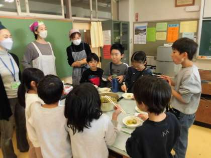 おいもがふかし終わりました。ふかしたおいもを子どもたちが食べます。口いっぱいにほうばっている人もいます。小さく切って食べている人もいます。子どもたちはみんな嬉しそうです。口々に「美味しい、美味しい。」と言っています。わたしも一口もらいました。おいもの甘みが出ていてとても美味しいです。