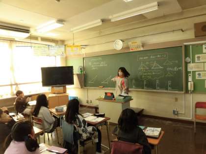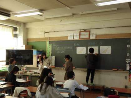 図形の面積の学習です。三角形の面積を求めています。公式を覚えるだけでは図形を見る力はついてきません。友達と考えを共有しながら考えを深めています。