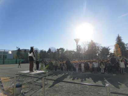 空気は少し冷たいですが、子どもたちはお日さまの光をしっかりと浴びて、朝会に参加しています。