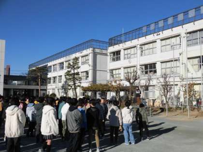 今日は月曜日、全校朝会があります。子どもたちが校庭に集まってきました。
