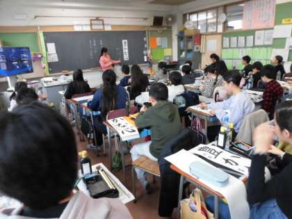 5年生の授業は習字です。書き初めの練習です。はじめに今日書く文字について、担任の先生が説明をしています。力強くそして、バランスよく書くためのポイントを話しています。子どもたちの力強い字、期待しています。