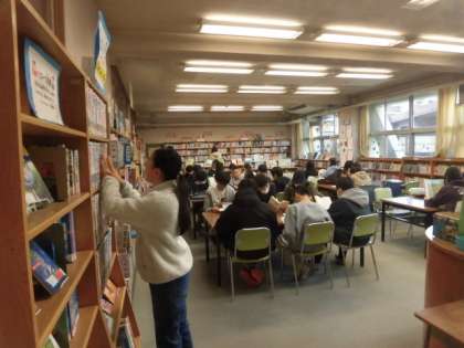 本を選び終わった人は、静かに席に座り本を読んでいます。話をしている人はいません。みんな静かに本を読んでいます。