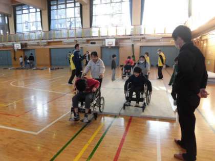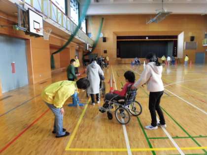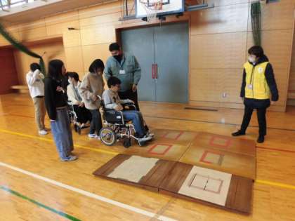 子どもたち同士で車いすを押し合います。マットの上は、やわらかく思ったよりも進みにくく感じたようです。乗っているときよりも、押しているときの方が緊張しているように見えます。とても貴重な経験をさせてもらいました。社会福祉協議会、地域の方々、ありがとうございました。