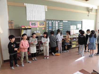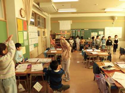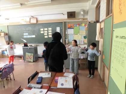 1年生の授業は音楽です。グループごとに歌を歌う練習をしています。振付などを混ぜ、とても楽しそうです。みんなにこにこしながら、歌っています。