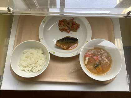 牛乳・ご飯(有機米)・冬至かぼちゃ汁・鯖のゆずみそかけ・蓮根のきんぴら