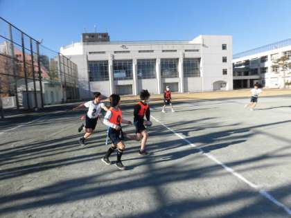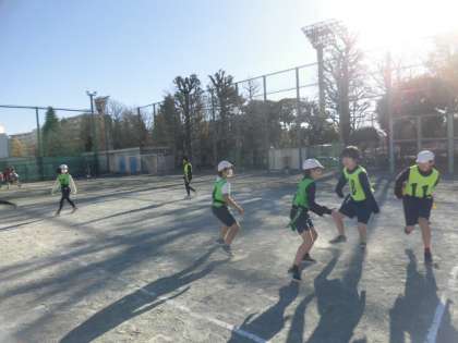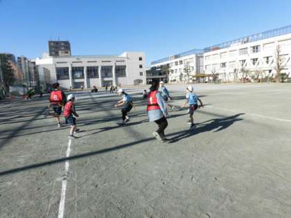 6年生の授業は体育です。校庭でタグを取る陣取りゲームをしています。
