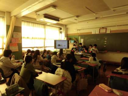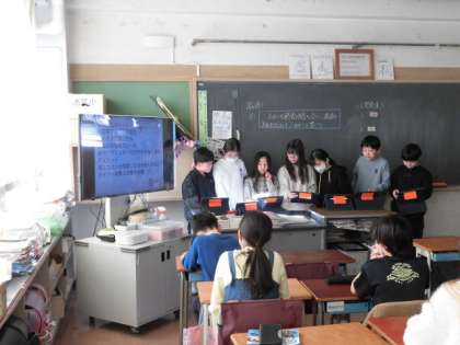 5年生の教室では社会科の情報について、班ごとの発表をしていました。レジスターの発表では、私も知らないことがありました。今のレジはとても進化しているようです。