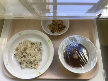牛乳・鮭のあけぼの寿司・きのこ入りおひたし・白玉汁こ
