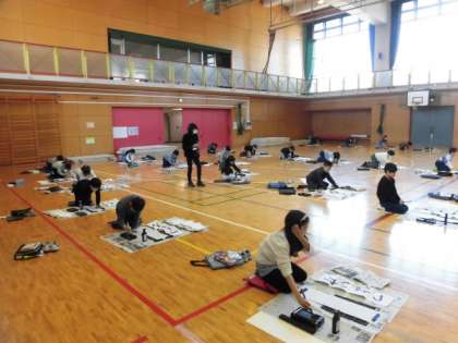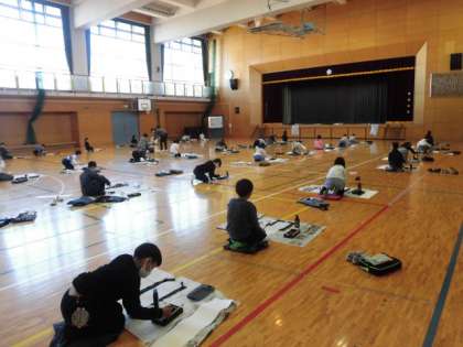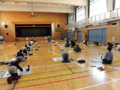 3年生は学年で集まって体育館で書き初めを行っていました。