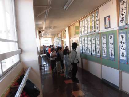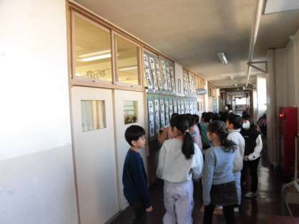 授業中、廊下を歩いていると、書き初め展を見学している3年生に出会いました。6年生の作品を見ています。3年生は、小声で「これ、すごくない。」「この人、すごくうまい。」などと話をしています。力作ぞろいの6年生の展示にびっくりしたようです。