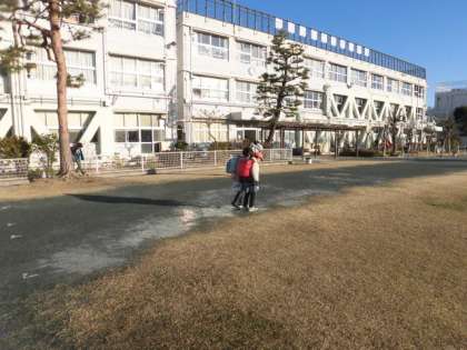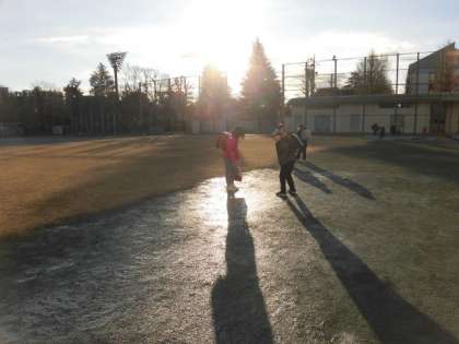朝の寒さのため、朝スプリンクラーで撒いた水が、校庭の土の上で凍っています。その上を子どもたちが歩いています。「氷なのにざらざらしてる。」子どもたちの感想です。