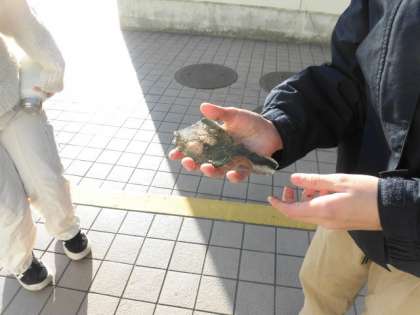 違うところで見つけた厚く張った氷を見せてくれる人もいます。「冷たい!」そう言いながら、なんだか嬉しそうです。