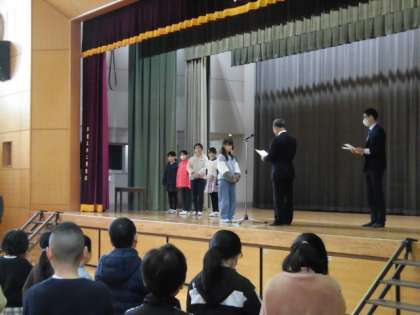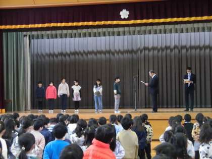 池尻まちづくりセンターの方々がいらしてくださり、リサイクルについてのポスターの表彰をしてくれました。7人の4年生が表彰を受けました。