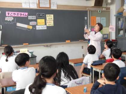たばこは吸う人だけではなく、そのまわりの人にも良くない影響があります。たばこを吸う人の肺の画像やたばこに実際に書いてある注意書きを見て、子どもたちは深刻な顔をしていました。これを機会に、自分の健康をしっかりと考えられる人になってほしいです。