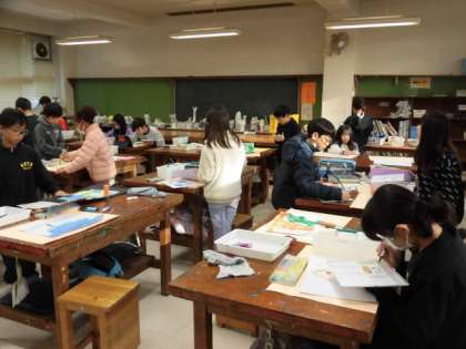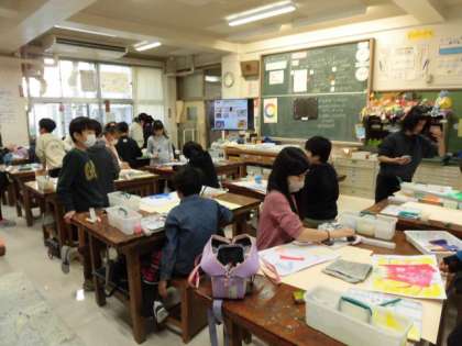4年生の授業は図工です。「へんてこな山」をイメージして、絵の具で色をぬっています。いろいろな山があります。子どもたちの発想は豊かです。一人ひとり描いたものを見ているととても楽しくなります。