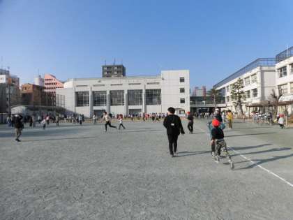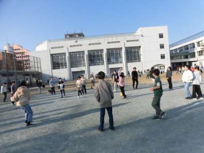 今日の朝の活動は朝遊びです。子どもたちが校庭に出てきました。