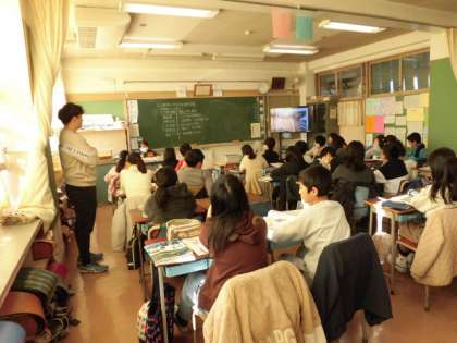 テレビに災害の状況をうつしてみんなで確認をしながら学習をしています。