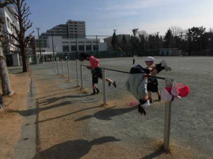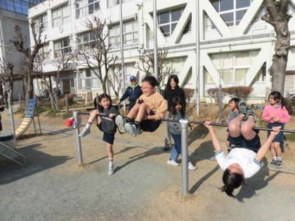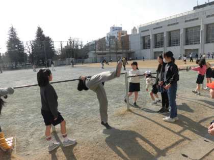中休みになりました。今日は鉄棒で遊びました。低学年の人がくるくる回っています。目が回らないか心配してしまいます。先生もやってきました。逆上がりに挑戦です。小学生のとき以来と言っていましたが、さすが、きれいに上がることができました。とても喜んでいる先生です。