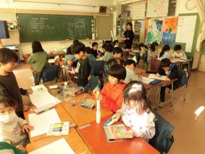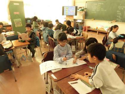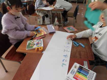 1年生は今度の保育園との交流の準備をしていました。遊びの準備をしている人、看板を作っている人がいます。みんなとてもうれしそうです。一つ年上のお兄さんお姉さんとして、小学校のことをいろいろ教えてあげてほしいです。
