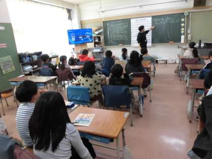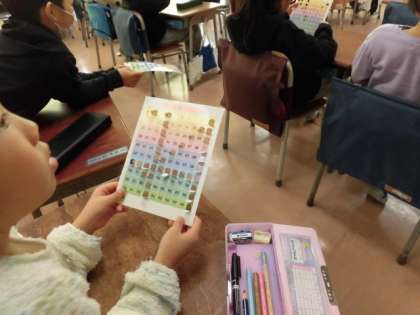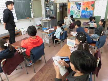100までの数の並んだカードを使って、並び方の法則を見つけています。よく見るといろいろな法則が見つかります。見つけた子どもたちは嬉しそうに手を挙げて発言しています。