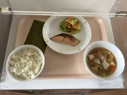 今日は、明治22年に提供された初めての給食を再現しました。本来はおにぎり・漬け物・焼き魚のみですが栄養バランスを現代にあわせるためにけんちん汁と海苔を追加しました。
