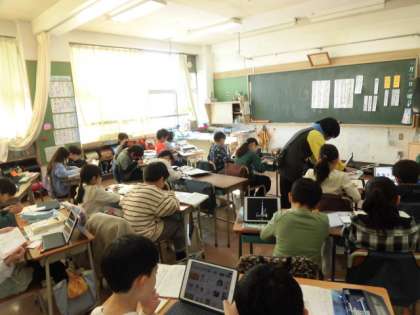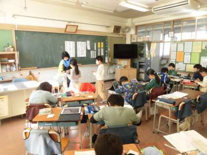 3年生の授業は国語です。一つの漢字の音読みと訓読みを使って文章作りをしています。子どもたちの作る文章はとても面白いです。嬉しそうに作ったカードを先生に見せに行っています。