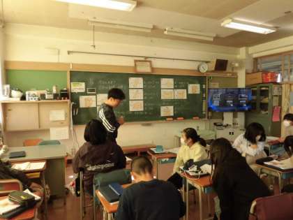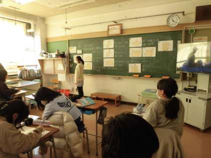 6年生の授業は算数です。面積や体積を求める問題をみんなで解いています。分からない問題があるときは、友達と確認をしています。