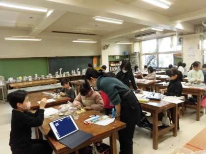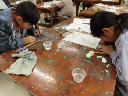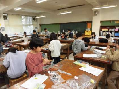 紙粘土に磁石を埋め込んで、磁石のマスコットを作っています。子どもたちは紙粘土を楽しそうにこねています。出来上がったマスコットを嬉しそうに見せてくれています。
