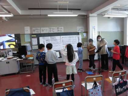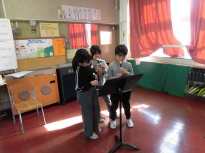 3年生の授業は音楽です。「パフ」をリコーダーでふいています。一つのグループの演奏をきいていました。3人でリズムを合わせてしっかりとふいています。気持ちを合わせながらふく様子を見て、友達と一緒に演奏することの大切さを改めて感じました。