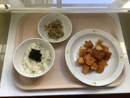 今日は、新メニューの鶏肉のかわりあえを提供しました。 ケチャップ風味の味なので子供たちに大人気でした。