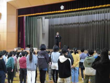 今日はお日さまも出ておらず気温も低いので、体育館で全校朝会を行いました。学級閉鎖はなくなりましたが、まだ風邪が流行っています。うがい手洗いをしっかりとやってもらいたいです。