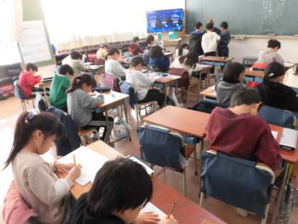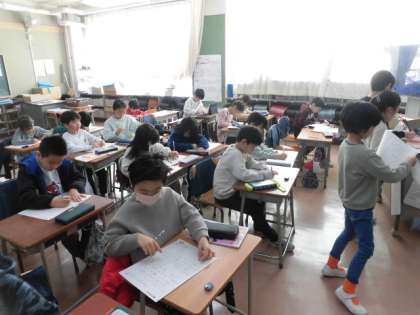 子どもたちはていねいにプリントに字を書いています。書きあがった人は、先生に見てもらっています。