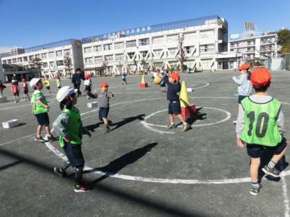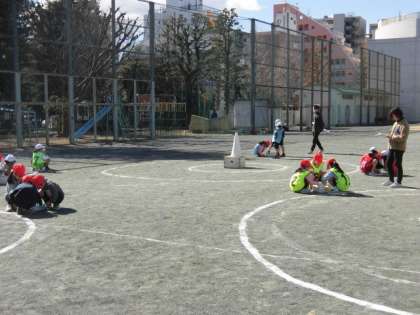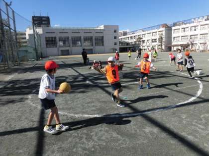 円の中の的に目がけてボールを投げています。相手チームの人が妨害をしているので、うまく作戦を考えなくてはなりません。子どもたちはゲームの途中の時間に集まって作戦を考えています。