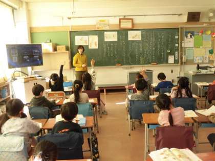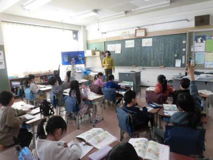 題材に出てくる動物たちを自分たちにおきかえ、子どもたちは考えています。子どもたちはしっかりと挙手し自分の考えを発言しています。