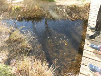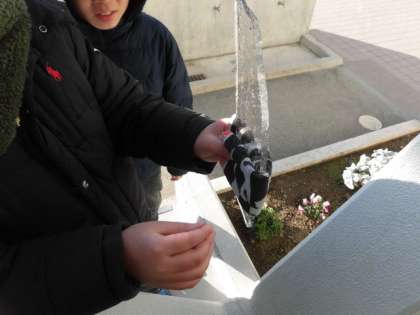 朝、早く登校した人がビオトープに氷がはっていることを知らせてくれました。嬉しそうに氷を割っています。