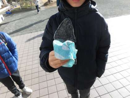 砂場のシートにたまっていた水も厚い氷になってようです。1cmぐらいの厚い氷になっています。冷たすぎるのか、タオルでくるんで見せてくれています。