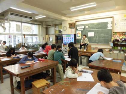 図工室に入ってびっくりしました。黒板の前の先生の机に椅子を乗せて子どもが一人座っています。先生も何も注意しません。周りの子どもたちは、その座っている人を見ながら、スケッチをしています。そうなのです。スケッチの学習です。びっくりしました。わたしの驚きように、モデルになっている人も、必死に笑いをこらえていました。