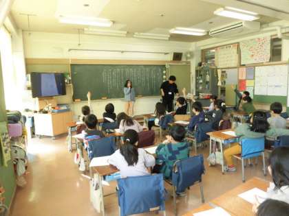 一人ずつ前に出て、発表しています。発表が終わった人は、次に発表する人を指名しています。嬉しそうに次の人を指名しています。友達の発表を聞くときの態度もすてきな1年生です。