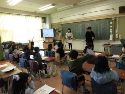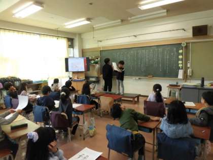 1年生の教室では、保育園の年長さんとの交流会の振り返りの発表会をしていました。